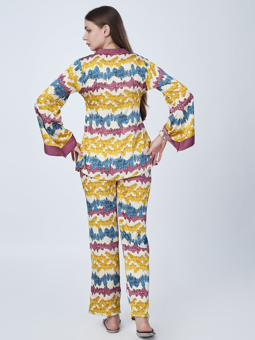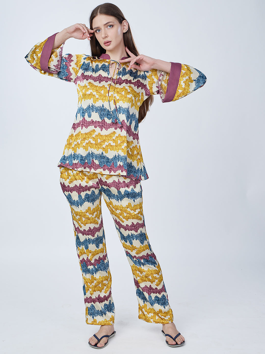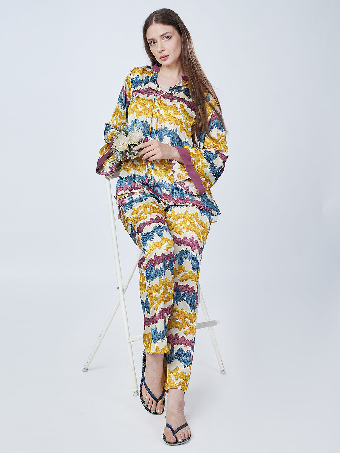 Milled from lightweight fabric with painted brushstrokes in sunset gold, aubergine, ocean teal, and ivory undertones, this two-piece set features a fluid band-collar top with tie detailing and tapered, stretch-infused pants. It is perfect for effortless elegance and all-day ease.