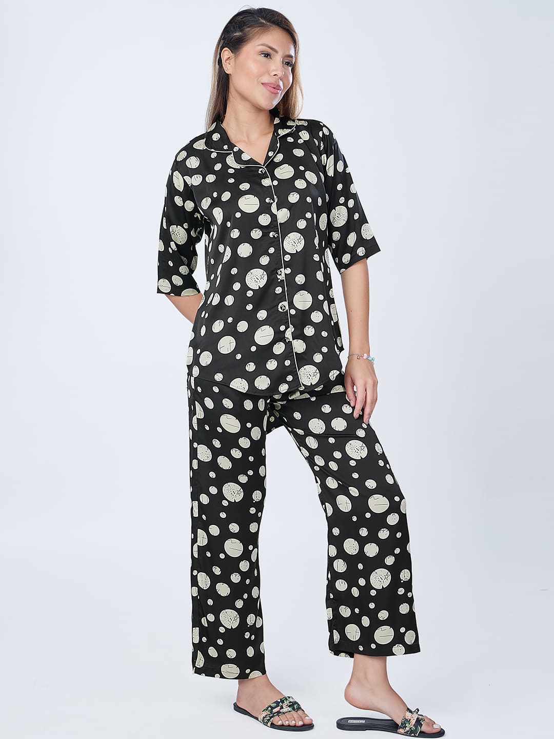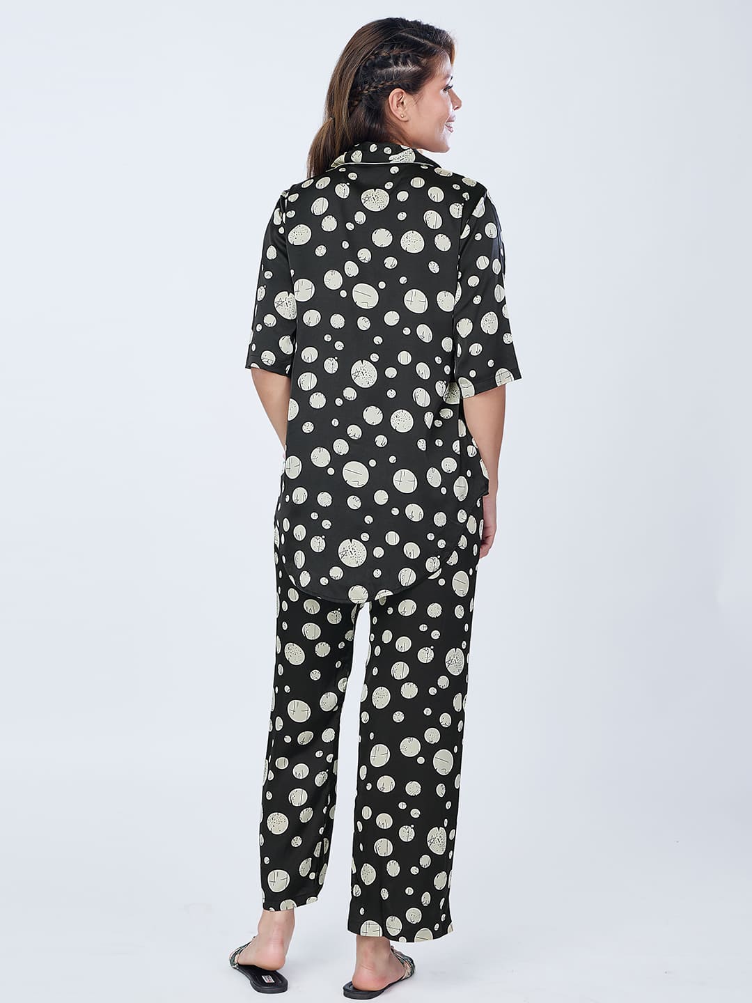Crafted on a black satin-finish base, this co-ord features cream abstract polka dots for a celestial, modern look. The half-sleeve, button-down shirt with notch collar and white piping pairs with relaxed-fit trousers. This set is ideal for nighttime lounging, weekend unwinding, and even gifting luxe comfort.