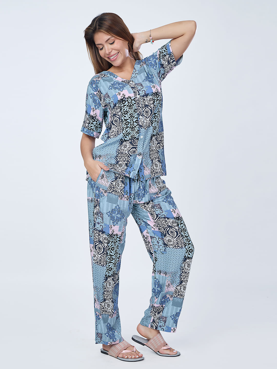 Crafted from premium lightweight fabric, this co-ord features Moroccan tile-inspired motifs in dusty blue, blush pink, and deep navy. The V-neck button-down top pairs with relaxed-fit bottoms for a fluid, elegant silhouette. This set is perfect for lounging, hosting, or travel-ready style.