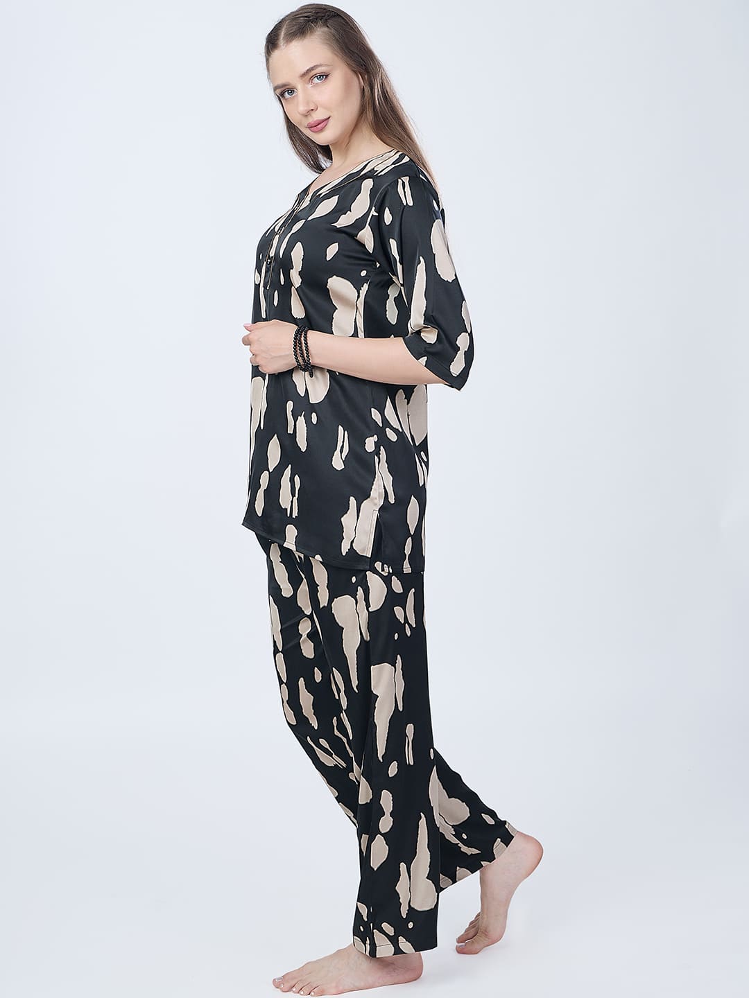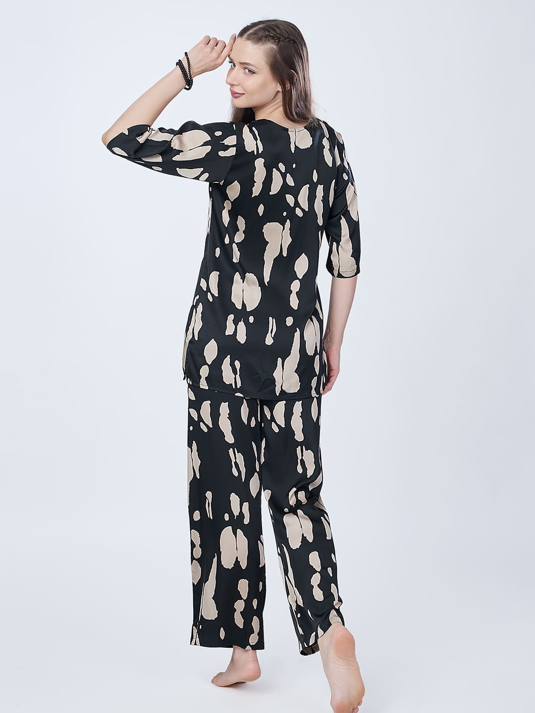 Crafted from smooth, silk-touch fabric, this co-ord features an abstract beige splash print on rich black, blending artful strokes with minimal elegance. The Henley-style top with contrast piping pairs with full-length elastic waist pants for effortless comfort. This set will complenent everything right from your slow mornings to chic brunches.