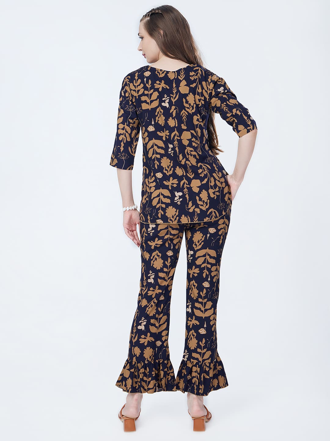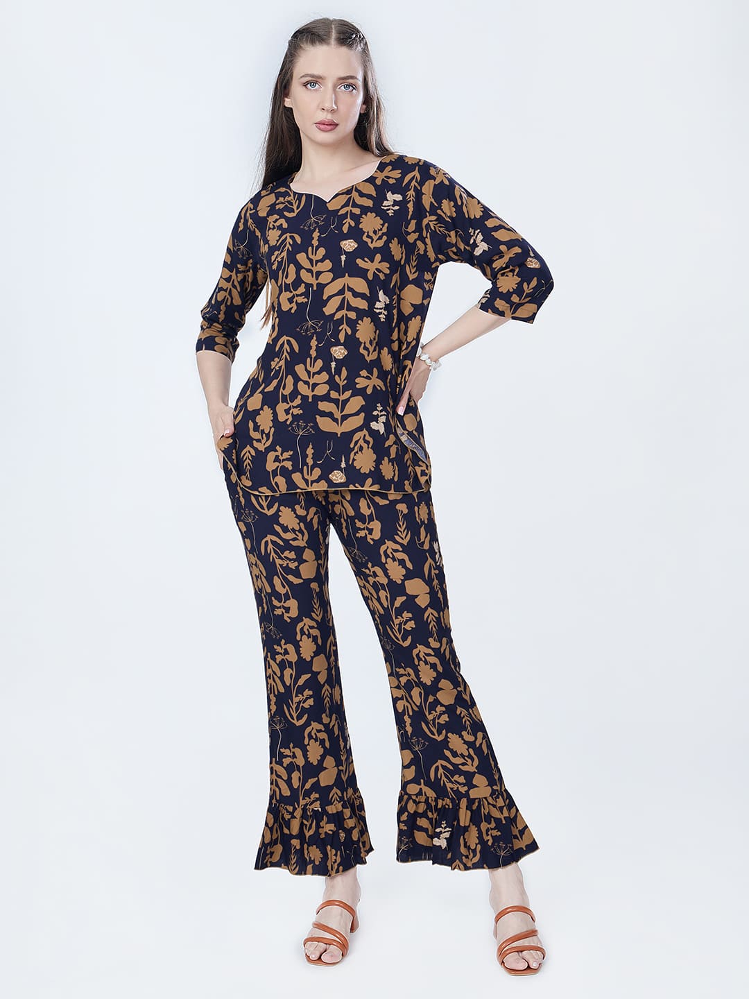 Crafted from buttery-soft, breathable fabric, this navy set with ochre botanical prints blends earthy elegance with comfort. The top features a relaxed drape and soft V-neckline, while ruffled-hem trousers with an adjustable drawstring add charm and ease to your lounge routine.